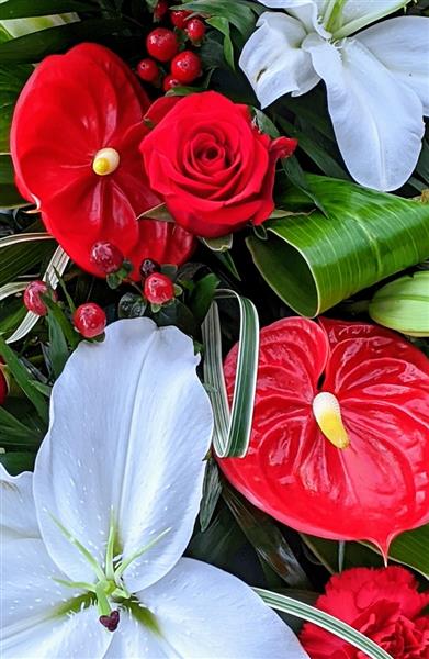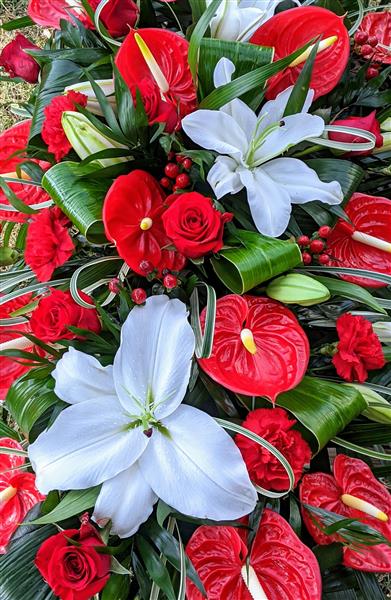 With bright red anthurium, roses and carnations.