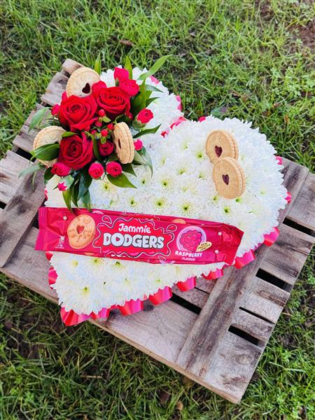 A classic, based heart with a biscuit twist. This one has been made to honour the persons love of a Jammie Dodger. Made with white chrysanthemum, red ribbon edge and matching red sprays with actual jammie dodger biscuits.