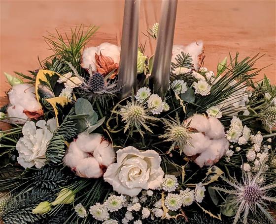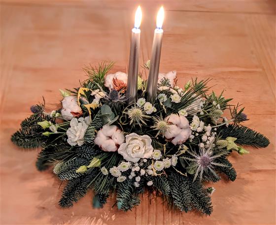A beautifully crafted festive centrepiece featuring elegant white flowers, soft candlelight, and lush Christmas foliage. Perfect for adding a touch of winter charm and warmth to your table.