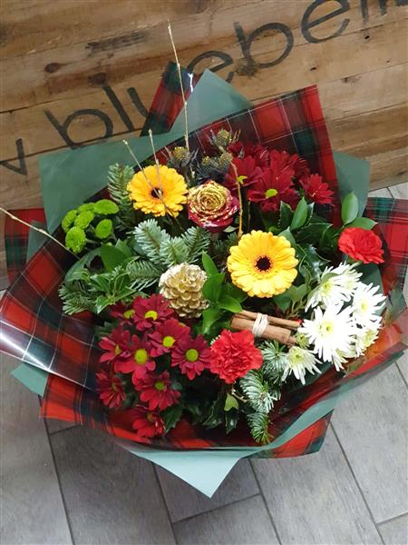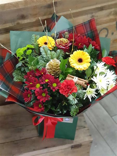 Wrapped in beautifully coordinated red, green, and tartan packaging, this arrangement captures the warmth, joy, and tradition of the season — perfect for gifting or decorating your home.