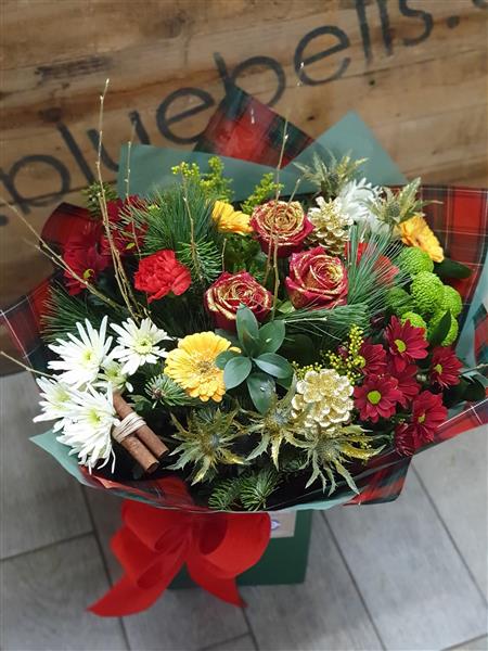 This stunning, traditional Christmas handtied bouquet is bursting with rich reds, vibrant greens, shimmering golds and seasonal foliage.