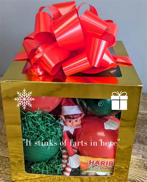 Filled with air inflated balloons, tissue, sweets and your Elf.