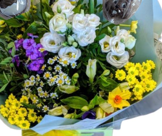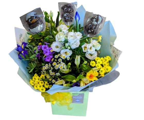 Delivered in a water bubble and wrapped in blue wrap & spring flower wrap with a yellow organza bow.