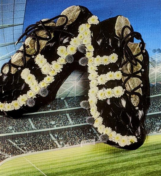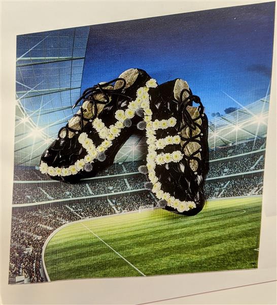 A 2 foot square laminated cardboard photo background with a pair of football boots in flowers.