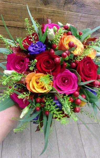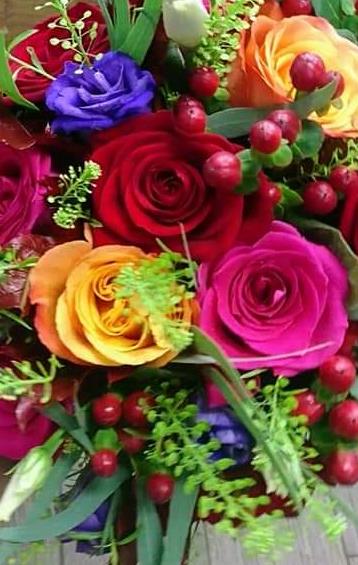 Roses in Bright Red, Cherise and Orange. With purple lisianthus,& red hypericum .