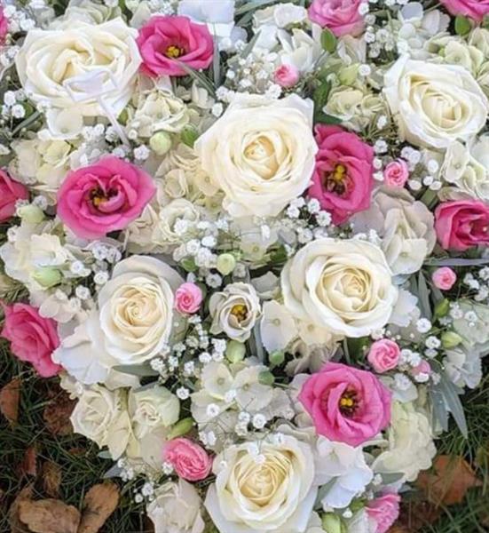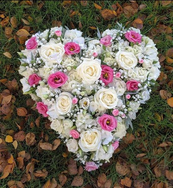 A beautiful heart design made of roses, hydrangea and other mixed flowers in links and Whites.