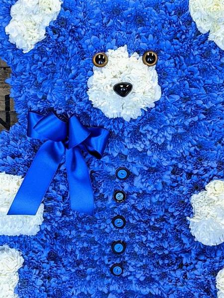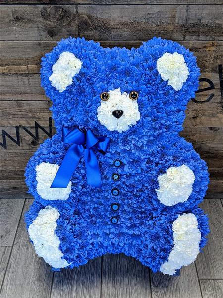 Large teddy tribute in blue with white paws and ears.