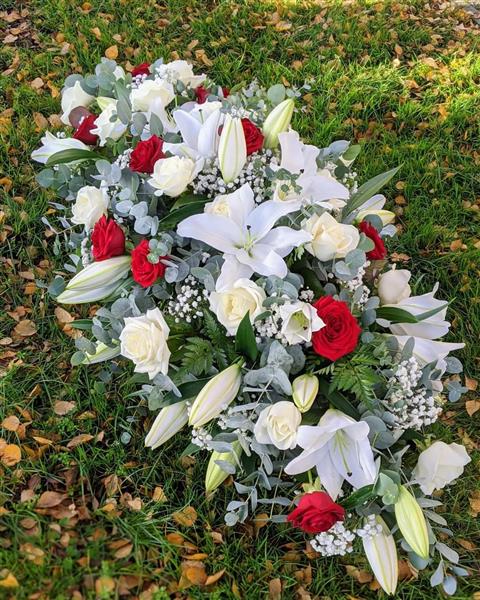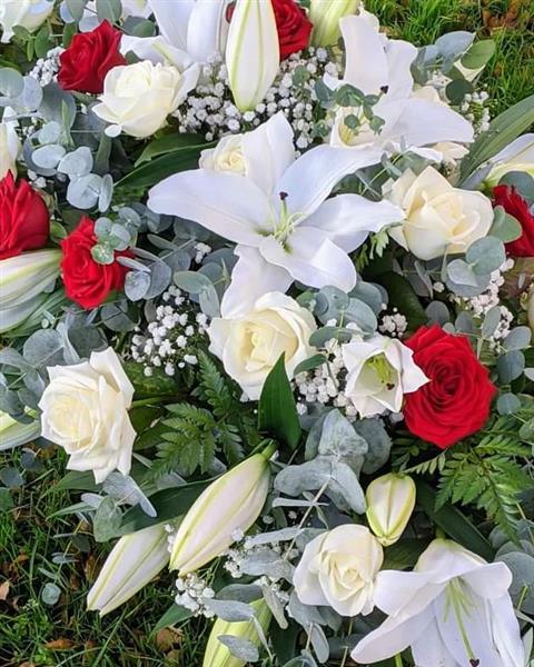 With beautiful deep red & ivory roses, white oriental lilies, gypsophila and mixed foliages .