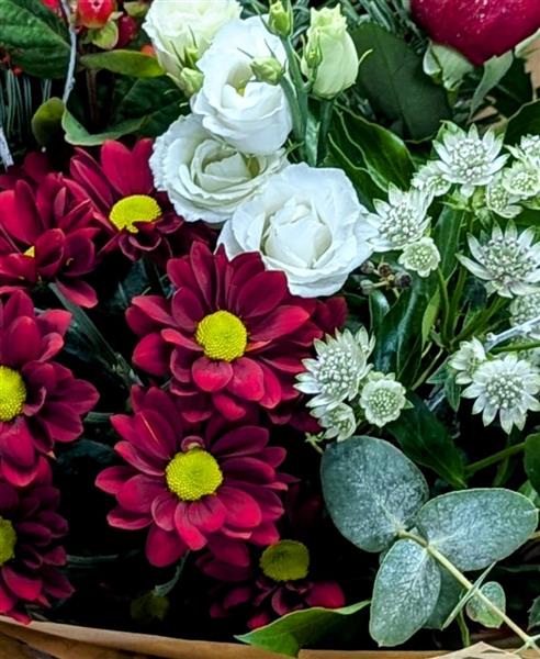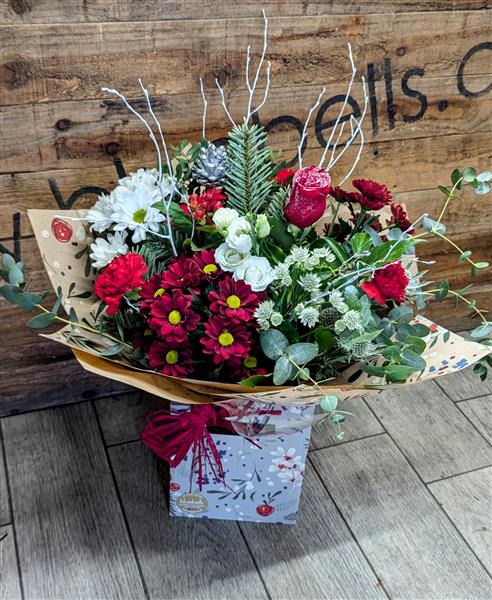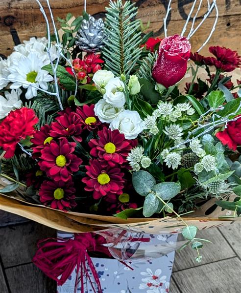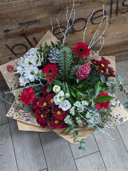 A gorgeous Christmas Handtied in red,white & silver.