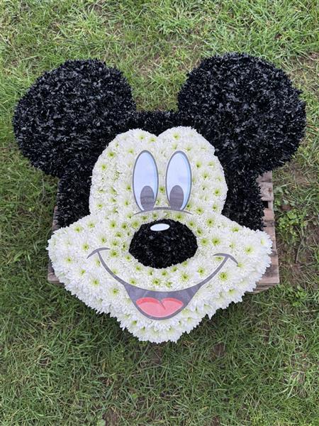 A charming tribute designed in the iconic shape of a Mickey Mouse face. Created mainly in a 2D style with fresh flowers, with bevelled ears and nose to add gentle depth and definition. A thoughtful and personal design, perfect for celebrating someone who loved Disney and bringing a touch of warmth and happy memories to their farewell.