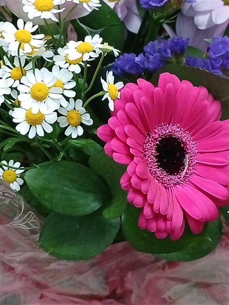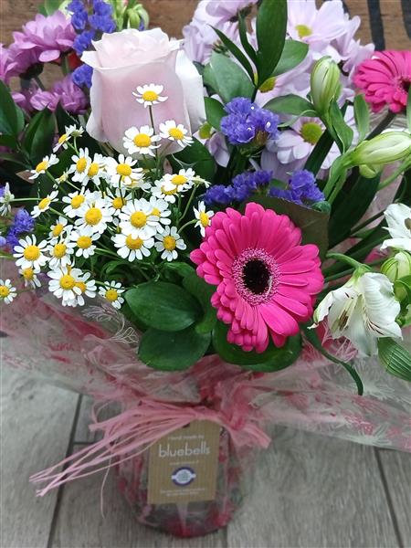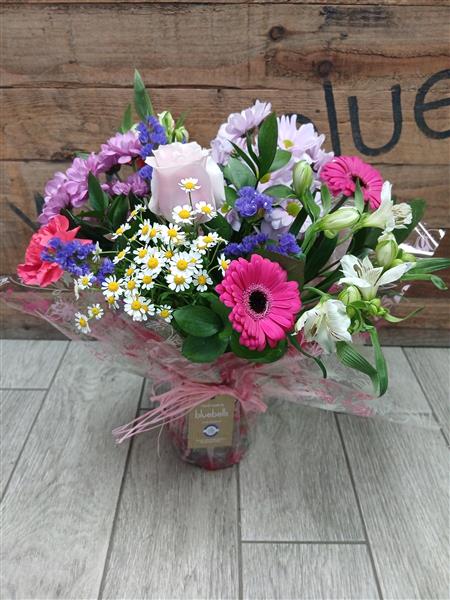 A pretty, pinky mix of flowers, arranged and delivered in a gift wrapped glass vase for your recipient to keep afterwards.
