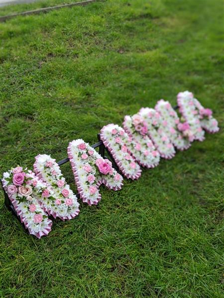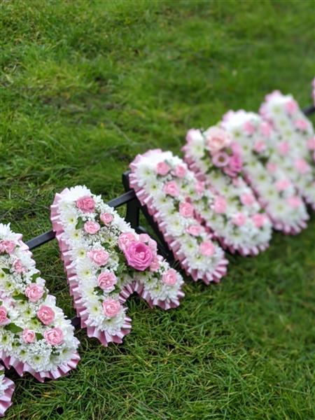 Pink ribbon edged , based in chrysanthemums around the letters with a centre row of pink spray carnations and gypsophila. With matching rose sprays