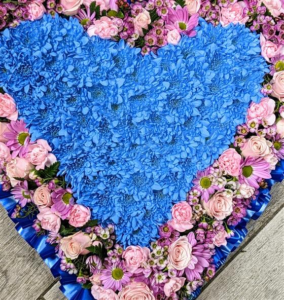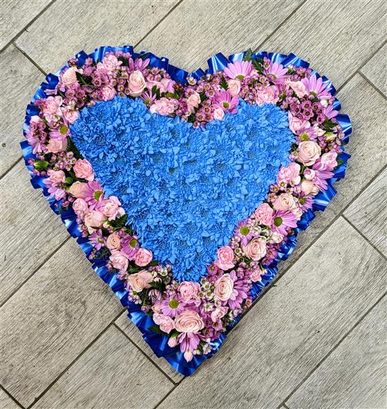 20 inch heart with a dark blue Ribbon edge loose pink flower and a middle section in blue.