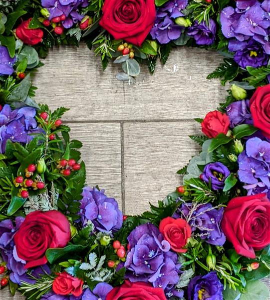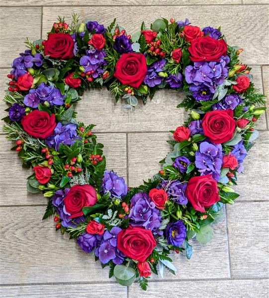 Red roses with purple hydrangeas, purple lisuanthus, and mixed foliages.