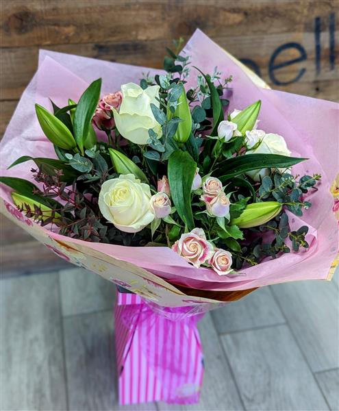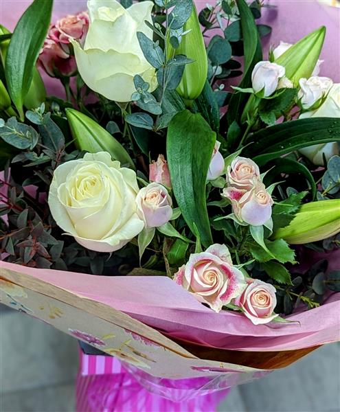 Beautiful Roses & Spray Roses, lilies and mixed foliages. Colours may vary from image.