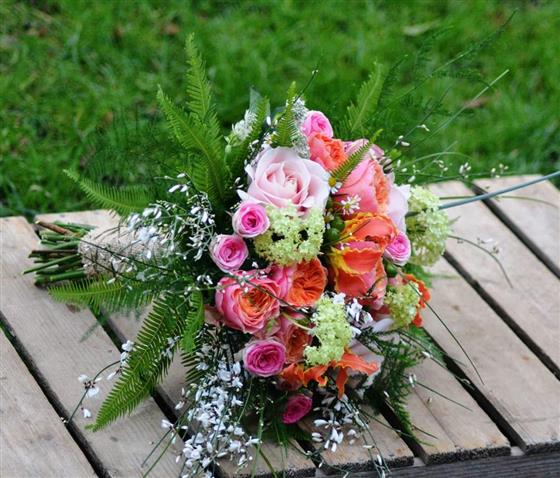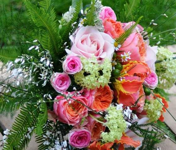 This bouquet has several different roses, spray roses, viburnum, genista, gloriosa and ferns