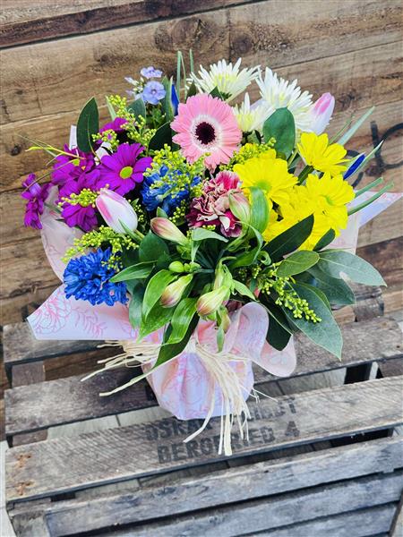 A beautiful vase arrangement of colourful spring flowers chosen from the best selection on the day.