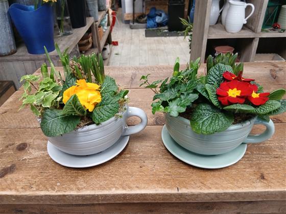 A large ceramic teacup planted with a scented hyacinth, narcissus, prim and trailing ivy.