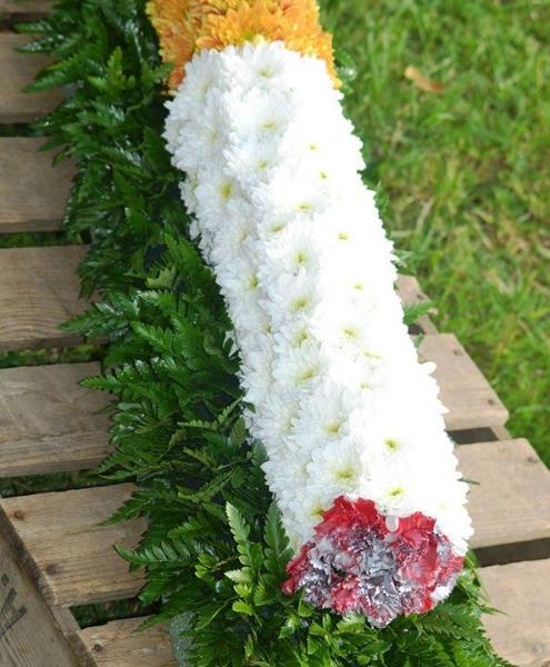 Approx 30 inches long made up of crysanthemums in different colours and a foliage base.