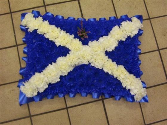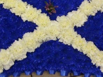Bespoke design of the Scottish flag. Made of crysanthemums & carnations with a sprig of either heather or thistle