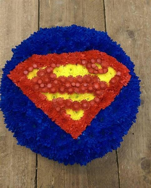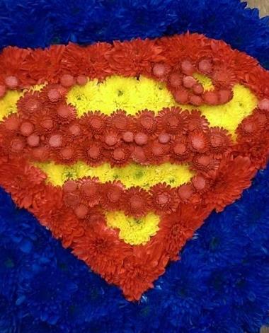 This tribute is for any superhero fans. The superman logo in flowers.Its 15inch diameter in red, yellow & blue