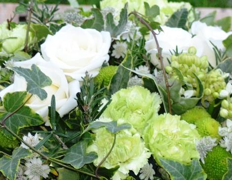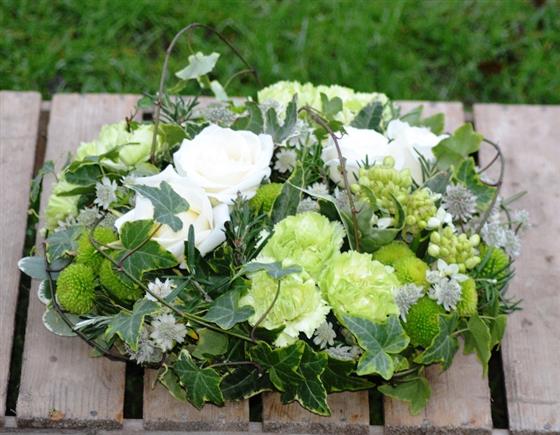 Image shows roses, carnations, astrantia, ornithogalum, kermit. trailing ivy and mixed foliages, flowers may vary due to seasonal availability.
