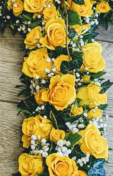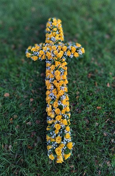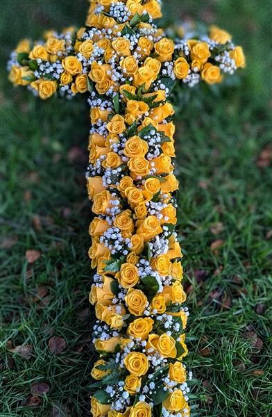 A Cross tribute in all yellow roses with gypsophila and mixed foliage.