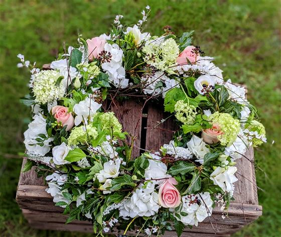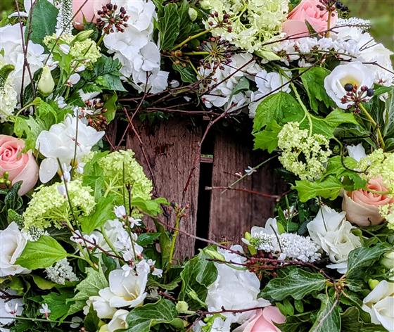 In roses, hydrangea, viburnum, freesia, genista, Veronica with birch twigs.