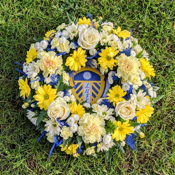 14 inch wreath in the Leeds Football Club badge colours with the logo in the middle.