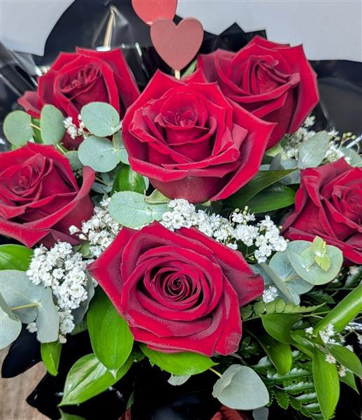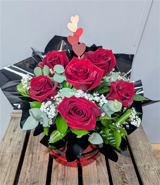 6 gorgeous large headed roses arranged into a red Hatbox
