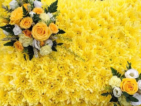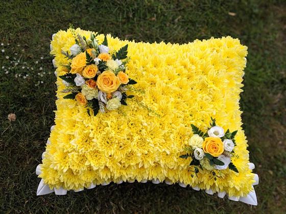 A classic pillow-shaped design created using a mass of yellow double spray chrysanthemums and finished with a sprays of
