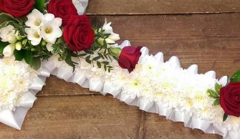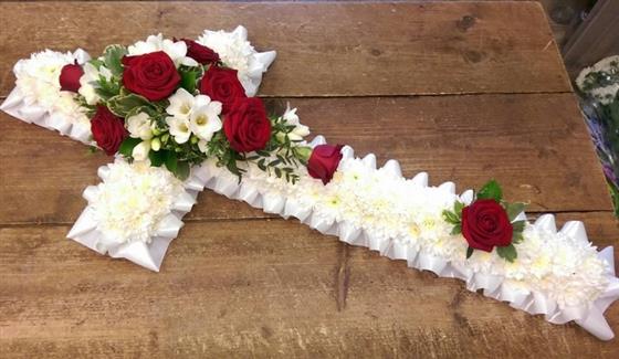 This classic cross is covered with a mass of white Spray Chrysanthemums.